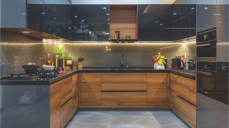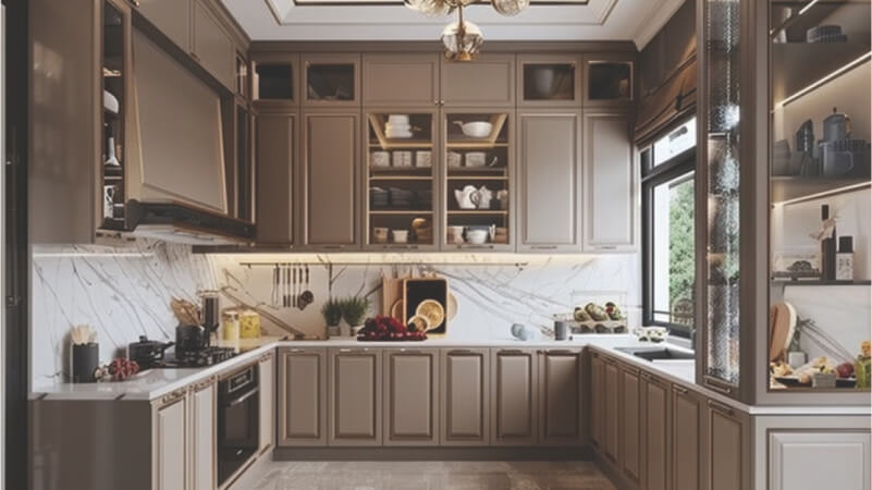 The U-shaped kitchen is synonymous with efficiency and organization. With its three-sided design, this layout offers abundant storage, counter space and room for appliances, creating a well-defined work triangle. Whether you’re preparing elaborate meals or tackling everyday cooking, the U-shaped kitchen ensures that everything you need is within easy reach. Its versatility allows for creative customisation, including built-in shelves, open cabinetry and smart lighting solutions, catering to both functional and aesthetic desires.